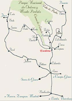 Vitoria/Gasteiz, Pamplona/Iruña (En autovía),- Jaca, Sabiñánigo, Biescas, Valle Broto, Boltaña, Aínsa, y 10 km. en dirección a Francia.